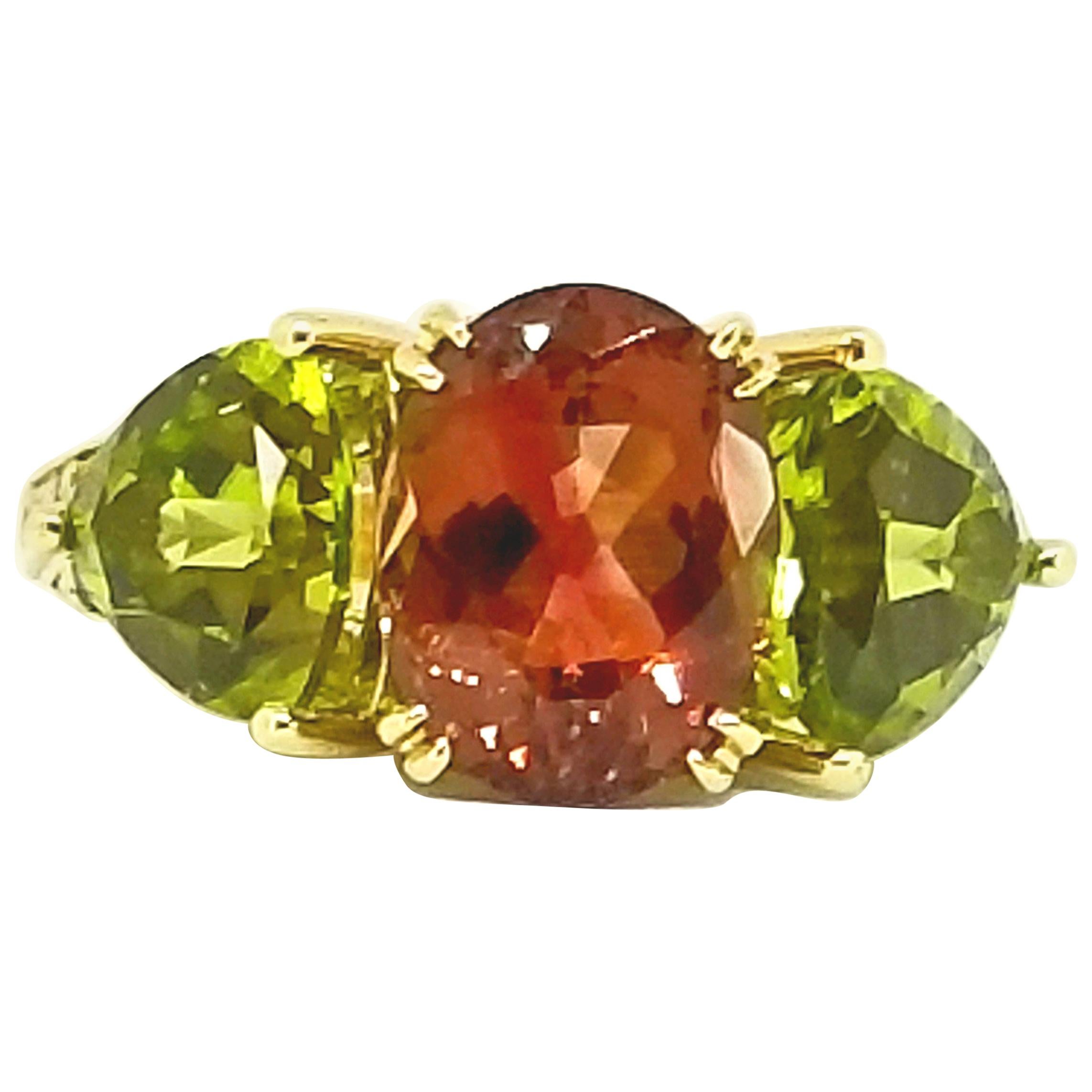 Brazilian Rose 3 16 Carat Tourmaline Peridot Diamond Three Stone Ring Gold At 1stdibs